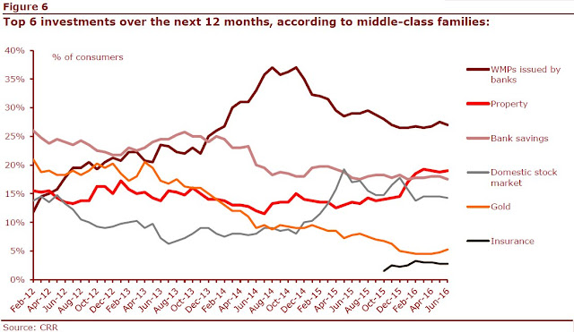 Callum Thomas documented the Chinese attitude towards investment preferences. As the chart below shows, bank deposits and WMP have tended to take the lead, largely because of the minimal investment size required. However, property (orange line) has held steady at about 15% over time.
