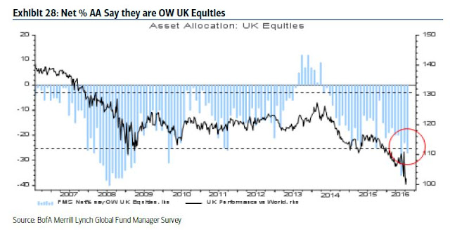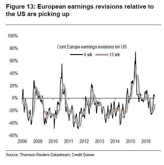 Capitulation on Europe. Many US clients believed Brexit meant the end of the euro (with Italian constitutional referendum being the next key event). Outflows are close to record highs, valuations are back to Greek crisis lows on P/E relatives yet earnings and economic momentum are showing signs of relative stability.