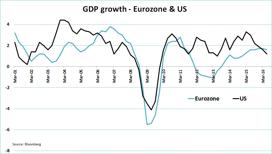 Blockland also highlighted the disparity in performance between US and eurozone GDP and equities. Spot the divergence in this chart: