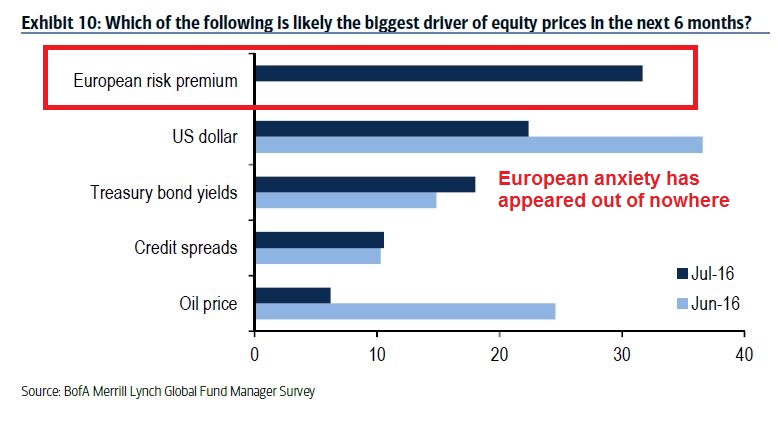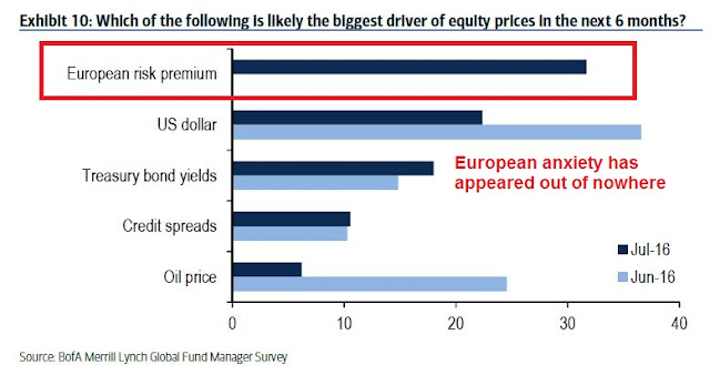 To be sure, an unusual level of anxiety about Europe has arisen lately. This can be illustrated by the latest BoAML Fund Manager Survey. When asked about the biggest driver for equity prices for the next six months, the unexpected answer was “European risk premium”. As the chart below shows, the issue was not on anyone’s radar screen in the previous month (chart annotation mine).