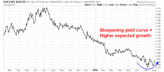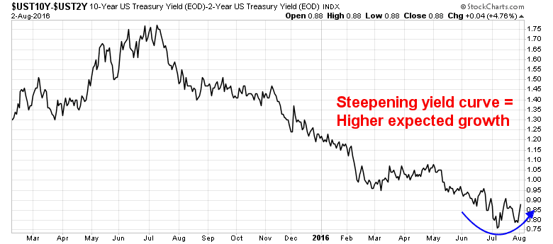 The bond market is also getting excited about growth. The 10-2 year yield curve is steepening. A widening spread between the 10-year and 2-year UST yields is a sign that the bond market is discounting high growth.
