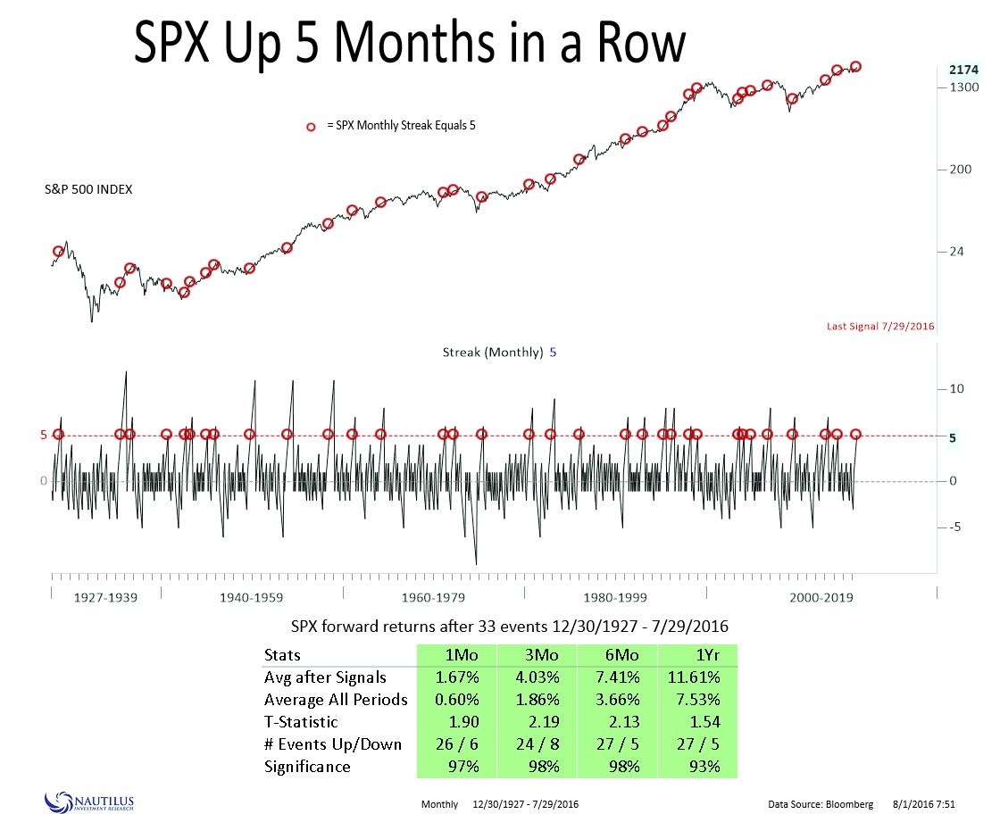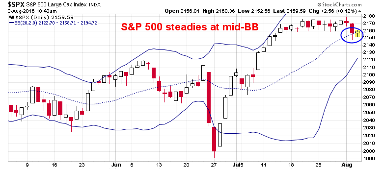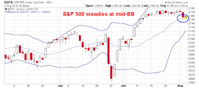 Against a bullish intermediate term fundamental and technical backdrop, the narrow consolidation after the bullish price surge off the Brexit panic low should therefore be interpreted as a pause. Barring significant macro or political surprises, the intermediate path of resistance is up and pullbacks are likely to be shallow. Chris Ciovacco recently wrote about the bullish implications of an index holding above its breakout point, which is roughly the 2120 level for SPX: