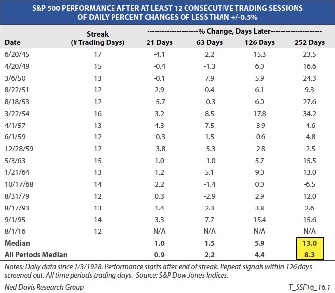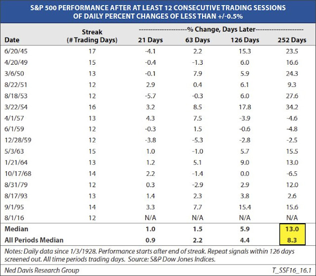 Here is Ned Davis Research with a study of market action after narrow consolidations. If history is any guide, 6-12 month returns after such episodes tend to be above average.