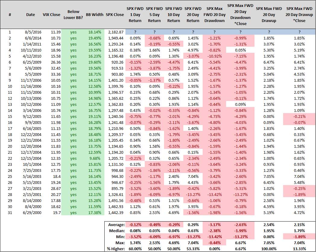 To fully appreciate the statistics from the above analysis, you have to be a bit of a math geek. Please note that the forward 1, 5, and 10 day median returns are flat, while the average returns over the same periods are negative. In addition, the % higher statistic over 1, 5 and 10 days are all 50%. That indicates that the typical returns after such trigger events (VIX below BB and lower BB width) tend to be flat, but there were instances where the market tanked so much that they pulled down the average return figures.