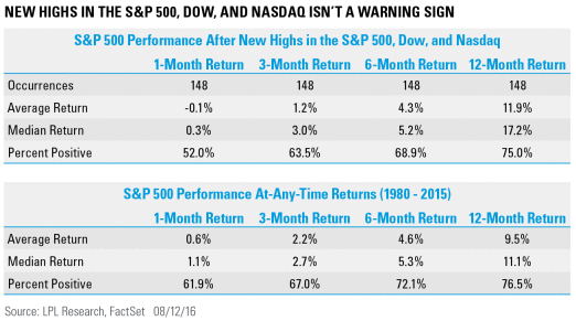 The Dow, SPX and NASDAQ made simultaneous new all-time highs (ATHs) on Friday, August 5, 2016 and repeated that feat again this week on Monday, August 15, 2016. Ryan Detrick of LPL Research pointed out that such events tend to be bullish. The chart below shows past instances of simultaneous new highs.