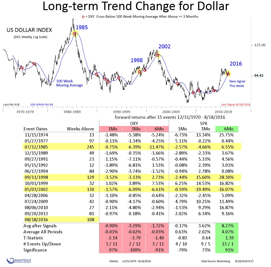 As well, Nautilus Research highlighted the fact that the USD Index has fallen below its 100 week moving average, which is consistent with my observation of commodity price strength. Past crossover episodes have resulted in short-term stock market weakness over a one-month time frame. Stock prices then recovered and advanced over the next three and six months.