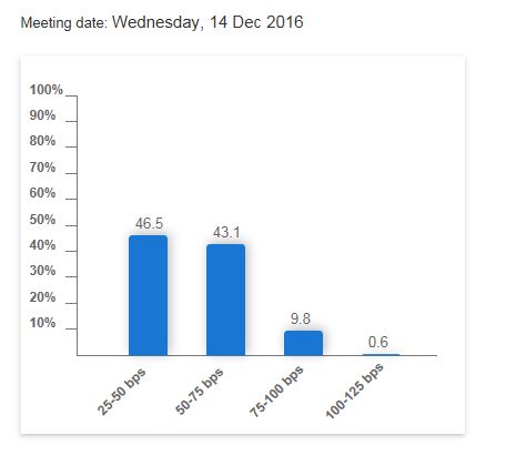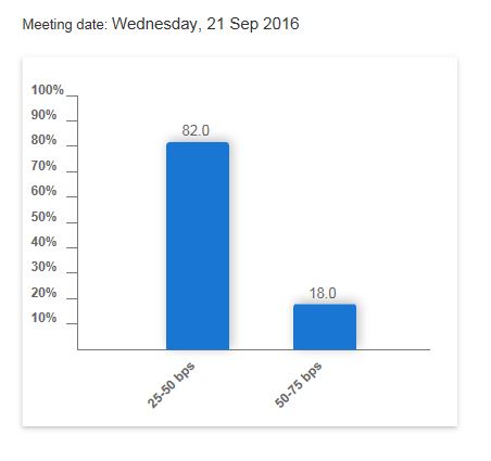 The odds of a rate hike at the December meeting is just over even odds at 53%. The Yellen Fed has shown an unwillingness to surprise the markets. If Janet Yellen plans to raise rates at the September meeting, then she will have to communicate a much tougher hawkish message at her Jackson Hole speech on Friday.