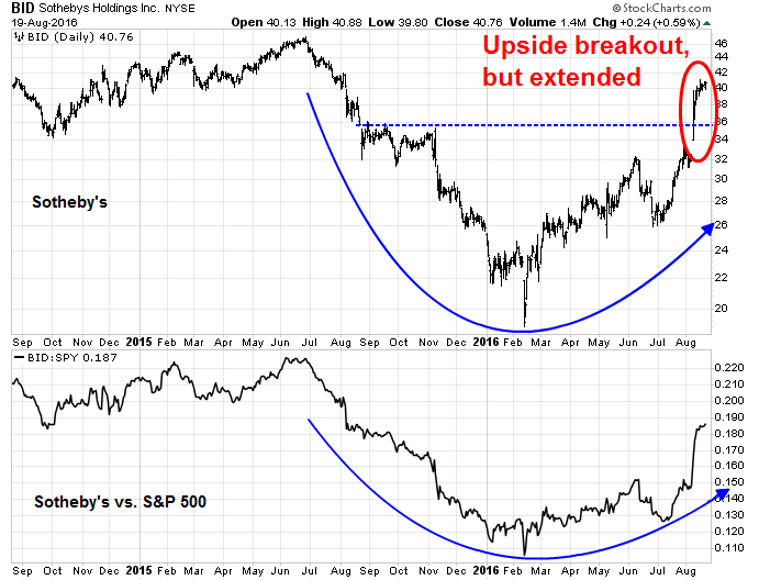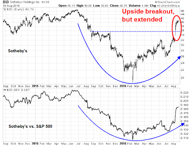 I used Sotheby’s Holdings (BID) as a proxy for the collectibles market. As the chart below shows, BID has rallied strongly and achieved an upside breakout, both on an absolute and relative basis. The stock appears to be a bit extended and may be due for a pullback, but the message from the market from mining, energy, and BID is the same: resurgent hard asset inflation.