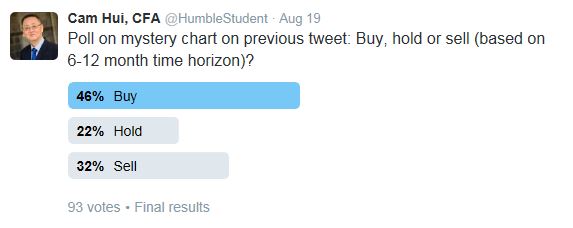 Bullish or bearish? The charted instrument is in a well-defined uptrend, but there is overhead resistance nearby. While I interpreted it bullishly, I wanted to be sure. A Twitter poll showed that the crowd agreed with me.