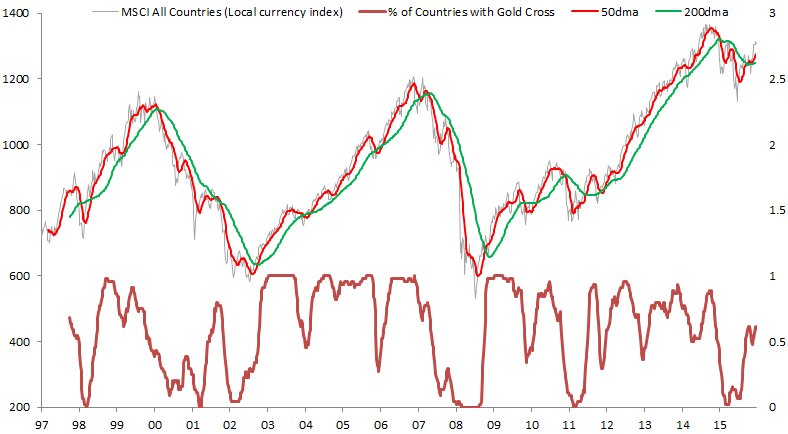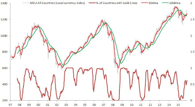 Stock markets around the world have begun to respond to the growth revival. Callum Thomas highlighted this chart, which shows the percentage of global market that have undergone golden crosses, which indicate technical uptrends (bottom panel). If history is any guide, this global reflationary rally has much more room to run.
