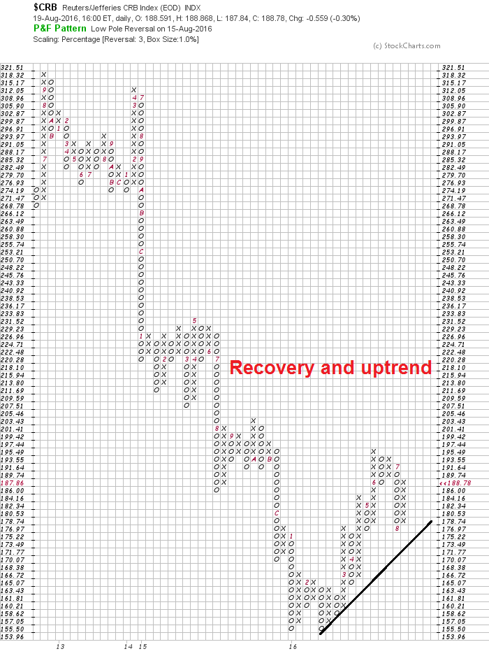 Here is the CRB Index. The CRB Index is heavily weighted in the energy complex and therefore more sensitive to movement in oil prices, which has been dragged down by its own demand-supply dynamics. Nevertheless, the pattern of a bottom and a recovery is the same as what we saw in industrial metals.