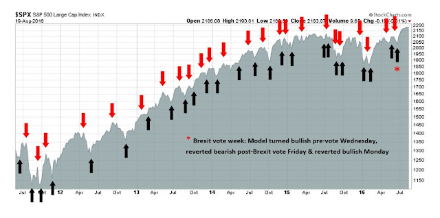 My inner trader uses the trading component of the Trend Model to look for changes in direction of the main Trend Model signal. A bullish Trend Model signal that gets less bullish is a trading “sell” signal. Conversely, a bearish Trend Model signal that gets less bearish is a trading “buy” signal. The history of actual out-of-sample (not backtested) signals of the trading model are shown by the arrows in the chart below. Past trading of the trading model has shown turnover rates of about 200% per month.