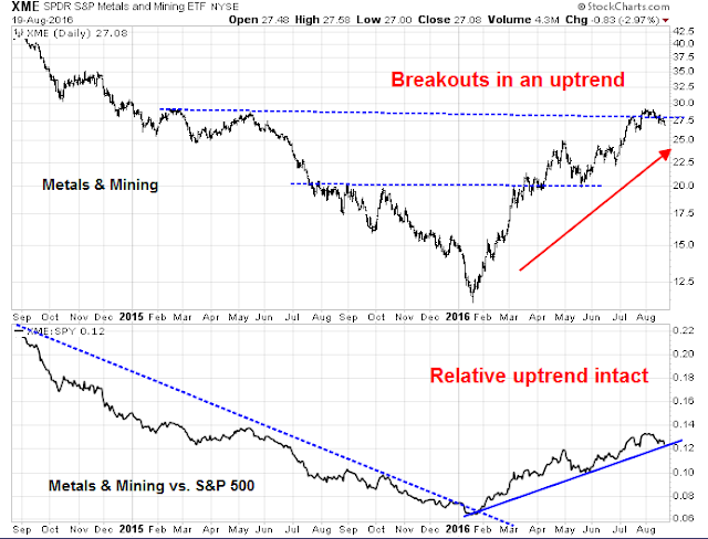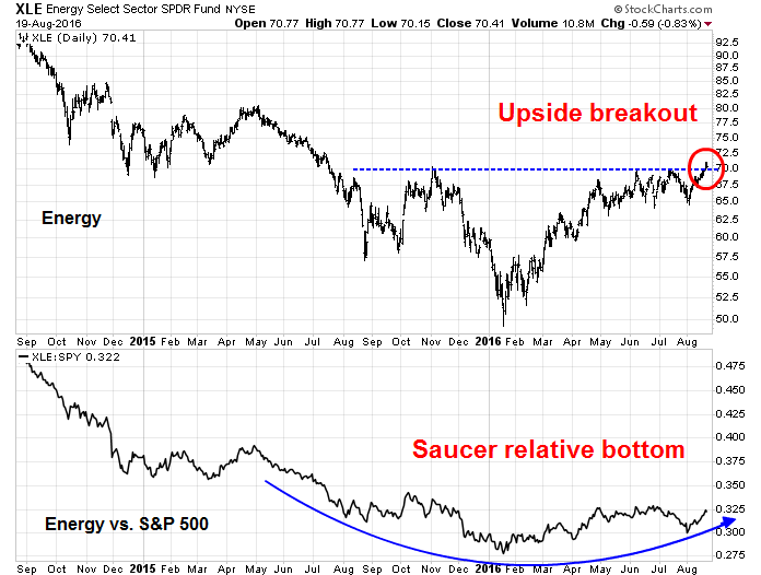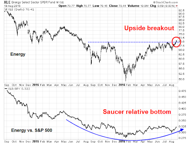 Energy prices have been weak compared to other major commodities. Nevertheless, energy stocks achieved an important upside breakout last week (top panel). In addition, they are tracing out a constructive saucer shaped bottom on a relative basis (bottom panel).