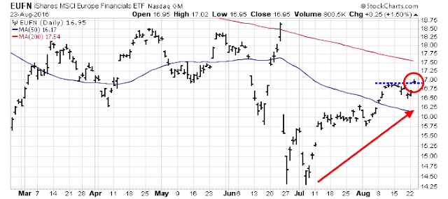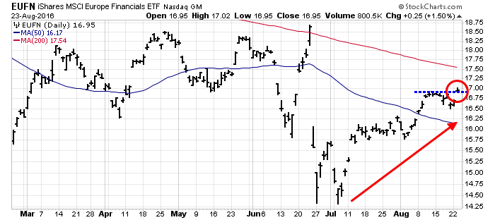 Remember all the hand wringing over European banks? This chart of European financials show that they are in an uptrend and broke out to a post-Brexit recovery high today.