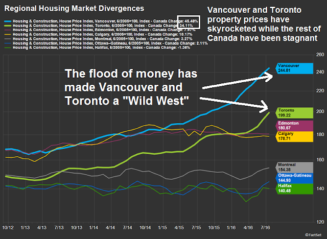 The main reason for the stratospheric prices has been called China’s Great Ball of Money and it has rolled into Canadian real estate. Factset recently documented how residential property prices have skyrocketed in Vancouver and Toronto while the rest of Canada have been flat as Mainland Chinese money has been buying in those two cities. Based on the stories that have surfaced recently, the flood of money has made the Vancouver and Toronto real estate markets a Wild West (chart annotations below are mine).