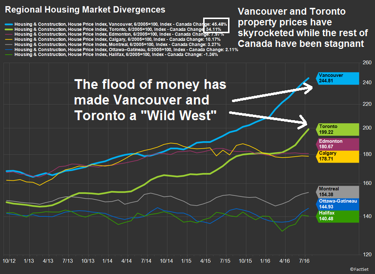 The main reason for the stratospheric prices has been called China’s Great Ball of Money and it has rolled into Canadian real estate. Factset recently documented how residential property prices have skyrocketed in Vancouver and Toronto while the rest of Canada have been flat as Mainland Chinese money has been buying in those two cities. Based on the stories that have surfaced recently, the flood of money has made the Vancouver and Toronto real estate markets a Wild West (chart annotations below are mine).