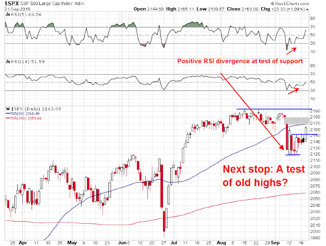 In the wake of the news from the BoJ and the Federal Reserve, SPX rallied above its interim resistance at 2150. The most likely short-term path is a re-test of the old highs at 2200. The next level of resistance is the 50 dma, which currently stands at 2168. In all likelihood, the gap at 2168-2177 will get filled.