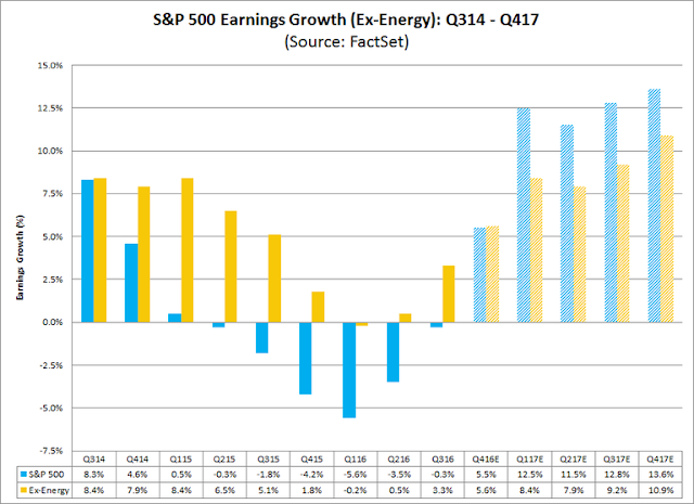 Earnings growth, which is a key driver of equity prices, looks solid. Factset pointed out that EPS growth would be positive in four of the last five quarters on an ex-energy basis.