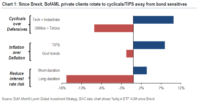 Momentum is turning positive for the reflation trade. The BAML Funds Flow report showed that clients were starting to rotate away from defensive assets and yield plays into cyclical and inflation hedge vehicles.