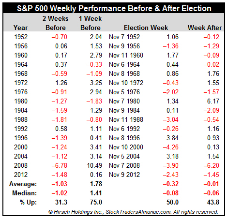 On the other hand, Hirsch pointed out in a separate post that the market tends to be weak two weeks before the election, which is also next week, and strong thereafter.