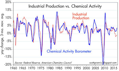 Even if the Fed were to raise rate, initial interest rate hikes tend to be stock market bullish, as market participants tend to focus more on the positive effects of rising growth expectations rather than the negative effects of rate increases. That scenario is starting to play out today. Scott Grannis pointed out that chemical activity tends to lead industrial production. Currently, chemical activity is on an upswing and industrial production should follow shortly.