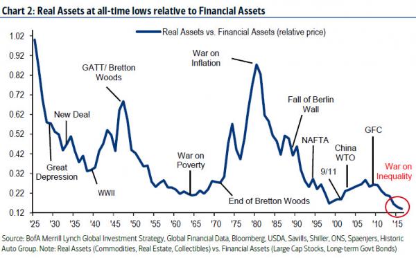 BAML strategist Michael Hartnett made the long-term case for buying hard assets because their relative value had gotten out of whack (charts via Zero Hedge).