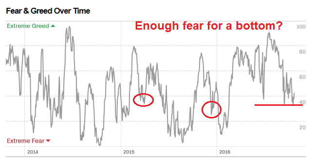 Selected short-term sentiment models are showing mildly oversold readings, though the market could get more oversold. The Fear and Greed Index is one such example.