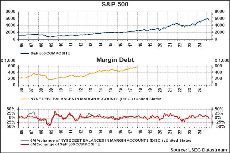 Here is a link to a chart of margin loans I constructed and check when the new monthly margin loan data is announced. keep it, it’s dynamically linked and will update automatically. Margin loans lead the market. The bottom chart compares the six month rate of change of margin loans versus the markets six month change. Loans lead the market. Note the blow-off in margin loan growth in 2000 and 2007 that warned of extreme speculation before the coming bear market.