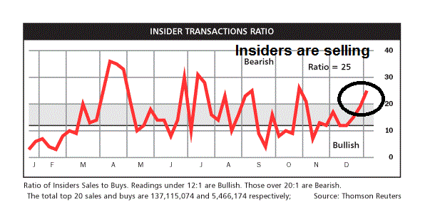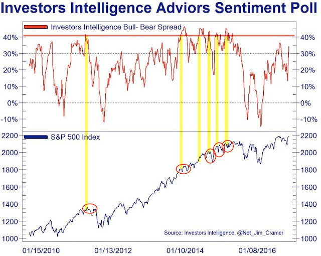 Looking to the week ahead, the Dow came within a hair of 20,000 at 19,999.63 and pulled back. Sentiment readings are overly bullish, which suggests a period of consolidation or pullback is ahead (via Urban Carmel).