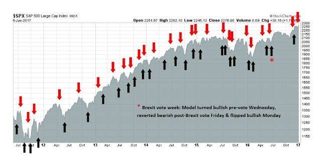 My inner trader uses the trading component of the Trend Model to look for changes in direction of the main Trend Model signal. A bullish Trend Model signal that gets less bullish is a trading “sell” signal. Conversely, a bearish Trend Model signal that gets less bearish is a trading “buy” signal. The history of actual out-of-sample (not backtested) signals of the trading model are shown by the arrows in the chart below. Past trading of the trading model has shown turnover rates of about 200% per month.