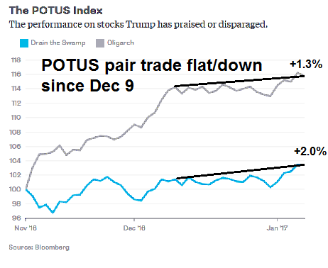 Independent of Muir’s analysis, Barry Ritholz constructed a POTUS Index, which consists of a basket of shares of companies that Trump has praised (grey line) and a basket of shares of companies that Trump has disparaged (blue line). As the chart below shows, this pair trade has been flat to down for the past month, which is indicative that the euphoria over the Trump election is fading (annotations are mine).