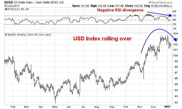 The chart of the USD Index is also telling a similar story. In this case, the USD Index is starting to roll over.
