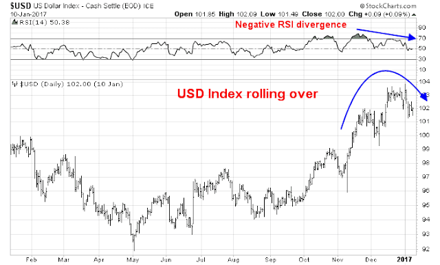 We can get some clues from market internals and the performance of other asset classes. Kevin Muir, writing at The Macro Tourist, pointed out that the “Trump trade” of long Russell 2000 and US Dollar, short gold and bonds has started to roll over after a huge rally since the election. These conditions suggest an environment of falling risk appetite.
