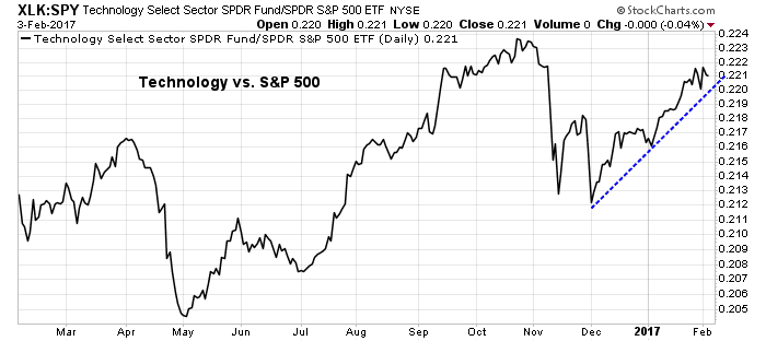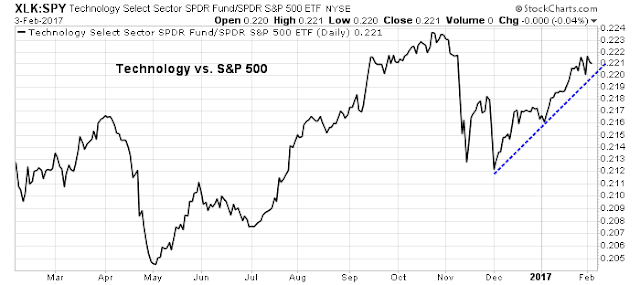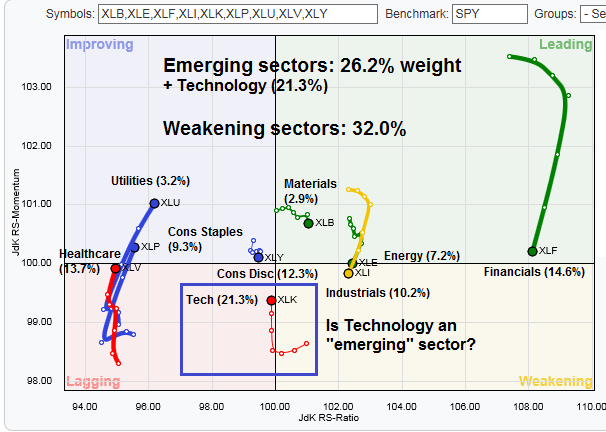 However, if the Technology sector, which is in the “lagging quadrant” and a heavyweight at 21.3% of the index, were to be re-defined as an “emerging sector”, the relative weight of rising sectors would overwhelm the relative weight of weakening sectors. In that case, the market could rally to new highs. Indeed, the relative performance of this sector appears to be highly constructive and supportive of such an outcome.