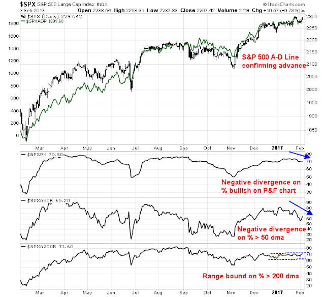 The top panel of the chart below shows the SP 500 Advance-Decline Line, which is not showing any negative divergence against the index. I prefer using this indicator over the more popular NYSE A-D Line as the former has the same components as the index and it is therefore an apples-to-apples breadth comparison. However, other breadth metrics, such as % bullish and % above their 50 dma, are exhibiting negative divergences against the index. On the other hand, the longer term % above their 200 dma is range bound. I interpret these readings as the intermediate term bull trend being intact, but the market may need to pause and consolidate its gains.