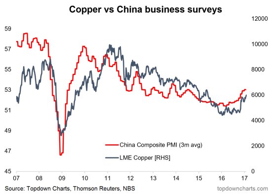Commodity prices are also good indicators of Chinese growth, largely because China is such a voracious consumer of raw materials. Callum Thomas of Topdown Charts found a high degree of correlation between copper prices and Chinese PMI.