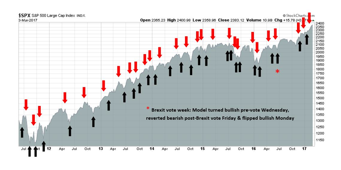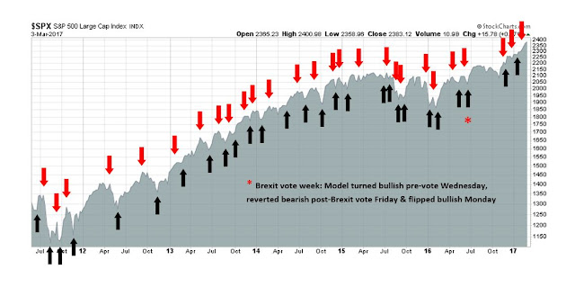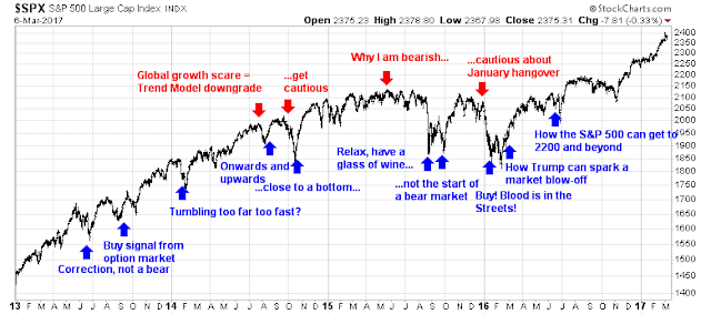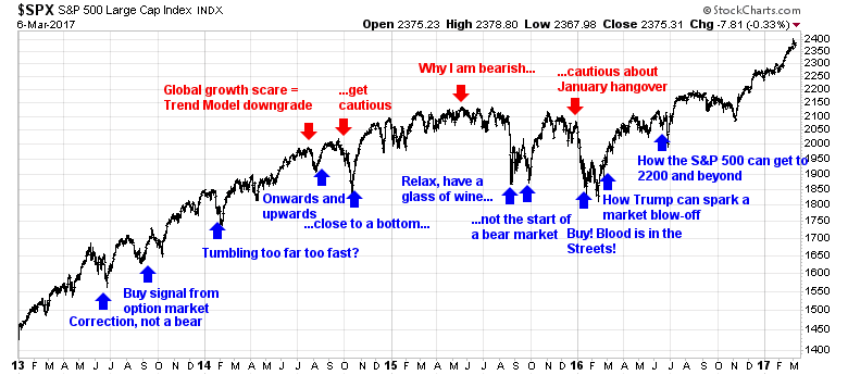 In addition, these are the buy and sell calls of the trading model, which are designed for traders with a 1-2 week time horizon. Again, I haven’t been always right. The most recent failure occurred when the trading model got caught long (and wrong) in the correction in late 2015.