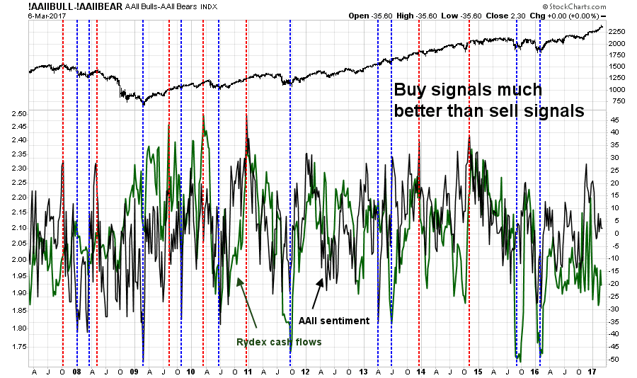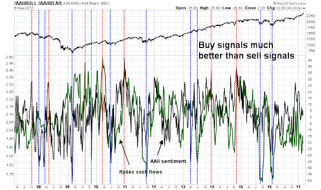 I would warn the bears, however, that sentiment models have a spotty track record at calling tops. Consider this chart of AAII sentiment (black) and Rydex cash flow sentiment (green). The blue vertical lines are the buy signals indicating periods of panic, while the red vertical lines show the bullish extremes. As the chart shows, the buy signals work much better than sell signals.