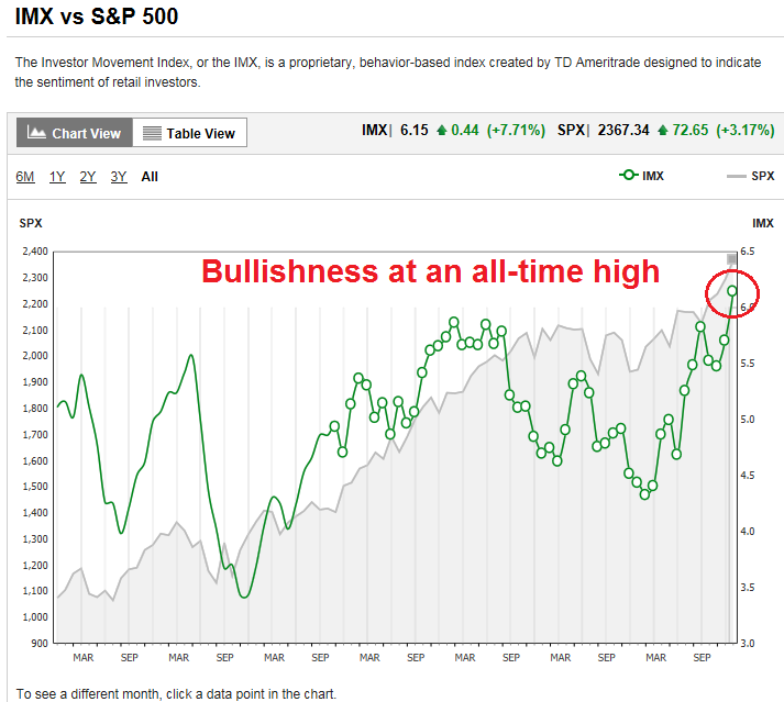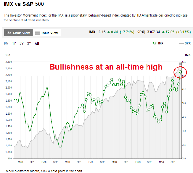 In the past few days, I have been surprised at the number of reports of excessively bullish sentiment. The latest readings from TD Ameritrade Investor Movement Index shows that retail investor bullishness at an all-time high (annotations in red are mine).