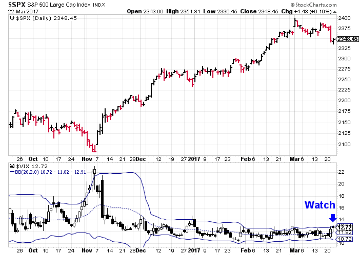 I have been watching for an oversold condition, defined as the VIX rising above its upper Bollinger Band. So far, that hasn’t happened yet.