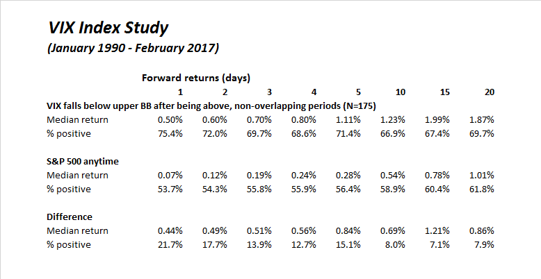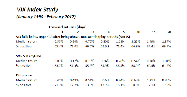 A mean reversion below the upper BB once the VIX has achieved the market oversold reading has been a reliable buy signal, as this study shows.