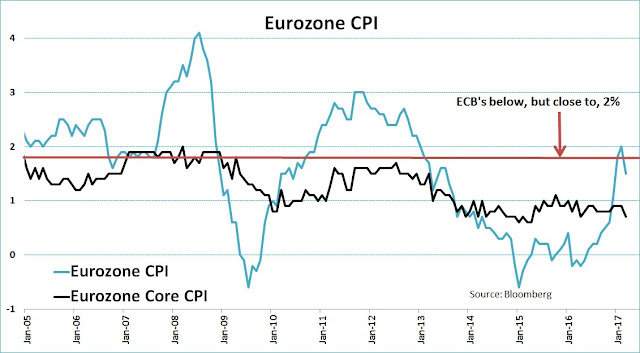 I recognize that eurozone core inflation rates came in well behind expectations in March, and the market reacted by reducing the odds of an ECB taper. But the Easter holidays falls in April this year, compared to March last year, and therefore inflation rates should snap back in April.