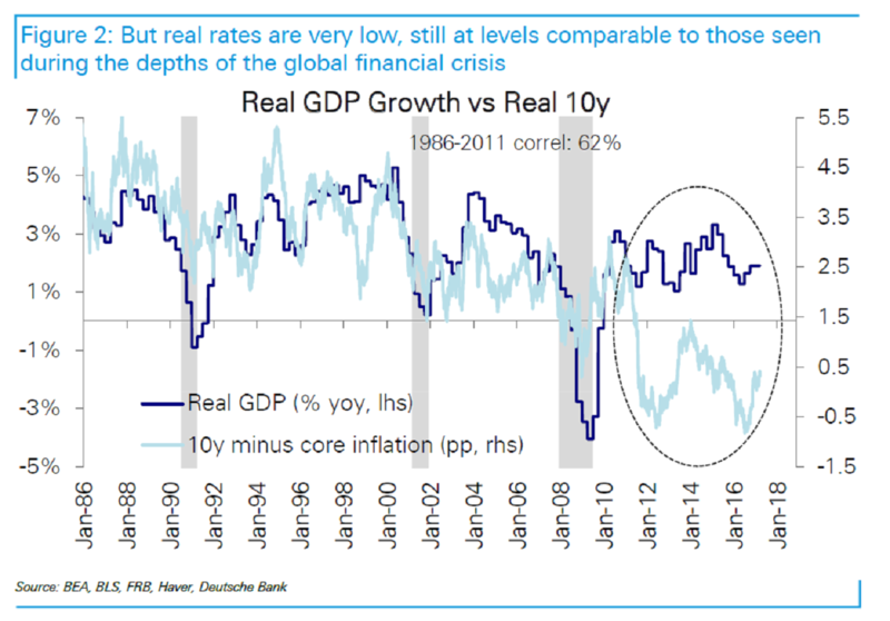 Real rates, which have generally moved in lockstep with real gross domestic product, are some two percentage points below what’s implied by the momentum of the U.S. economy, an unsustainable divergence, according to Deutsche Bank AG.