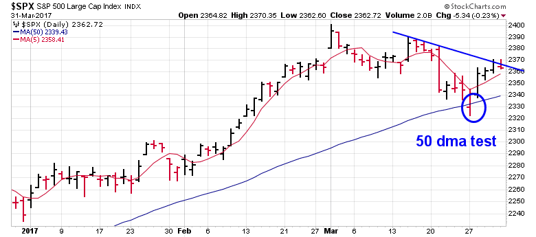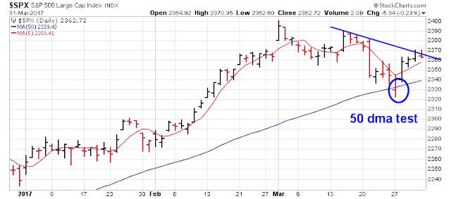In the short run, the market is approaching some lines in the sand that delineate bullish and bearish impulses. The SPX successfully tested its 50 dma last week and it is now testing downtrend resistance. Further strength will likely signal a rally to test the old highs.