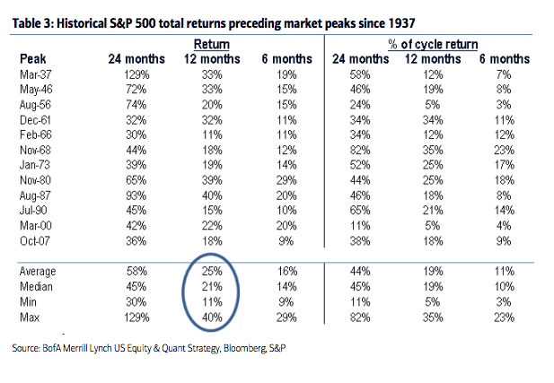 I’ll also note that the high for the S&P 500, thus far, was reached on March 1st. That high happened to be 21.4% higher than the close of the S&P exactly one year earlier. That 21.4% increase happens to be exactly the median of the final year increase of a bull market according to BAML’s work. Is my point that we reached a high for this multi-year bull market on March 1st this year? No. I am just pointing out that the BAML analysis is useless since the absolute peak is only known in retrospect.