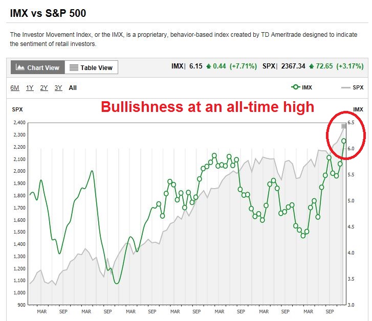 I beg to differ on the question of investor psychology, as I am seeing signs of giddiness everywhere. The T-D Ameritrade Investor Movement Index (IMX), which measures the sentiment of that firm’s retail investors are, is at an all-time high.