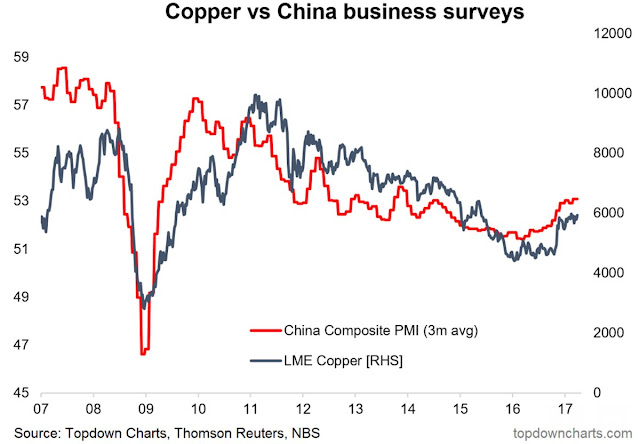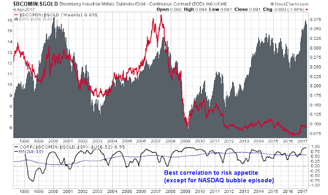 One of the disadvantages of using lumber prices as the cyclical component in a lumber/gold ratio is lumber prices are reflective of regional demand and does not measure the global cycle. For that, industrial metals is a better substitute. Callum Thomas pointed out that copper, which is one of the major industrial metals, is highly correlated to Chinese manufacturing momentum.