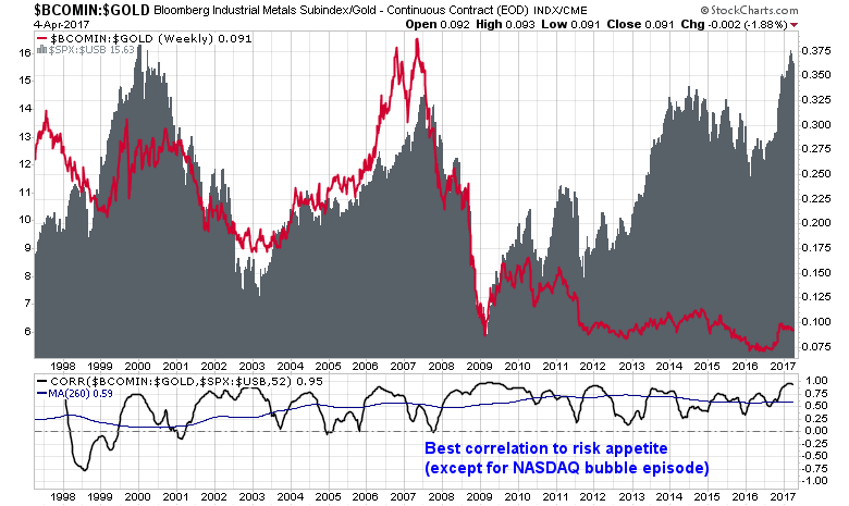 Currently, this ratio is supportive of a rising risk appetite as lumber prices, which is reflective of housing strength (and possibly the Trump wall with Mexico), are in a relative uptrend compared to gold.