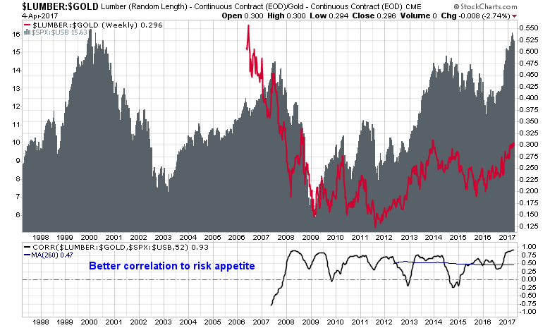 The history of lumber prices don’t go back 20 years, but the chart below shows the lumber/gold ratio against the stock/bond ratio, as a measure of risk appetite. The bottom panel shows that rolling one-year correlations were more stable. My conclusion is this ratio is more suitable as a momentum indicator rather than a contrarian indicator. The rolling 5-year average of lumber/gold to stock/gold is 0.47, which is pretty good.