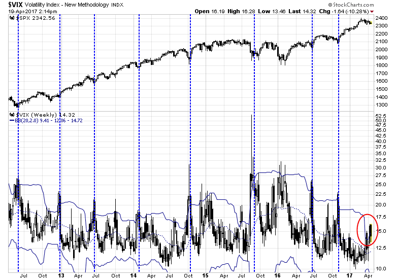 In addition, we are also seeing the rare condition of not only the VIX Index rising above its daily BB, but the weekly VIX above its BB (see Buy! The party is still going strongly). Should the VIX close at or near current levels, we will have a buy signal based on a weekly time horizon. The chart below shows that there were 8 signals in the last 5 years. This has been unabashedly bullish. With the exception of the double dip to test the lows in 2015, the market went straight up in all of the other cases.